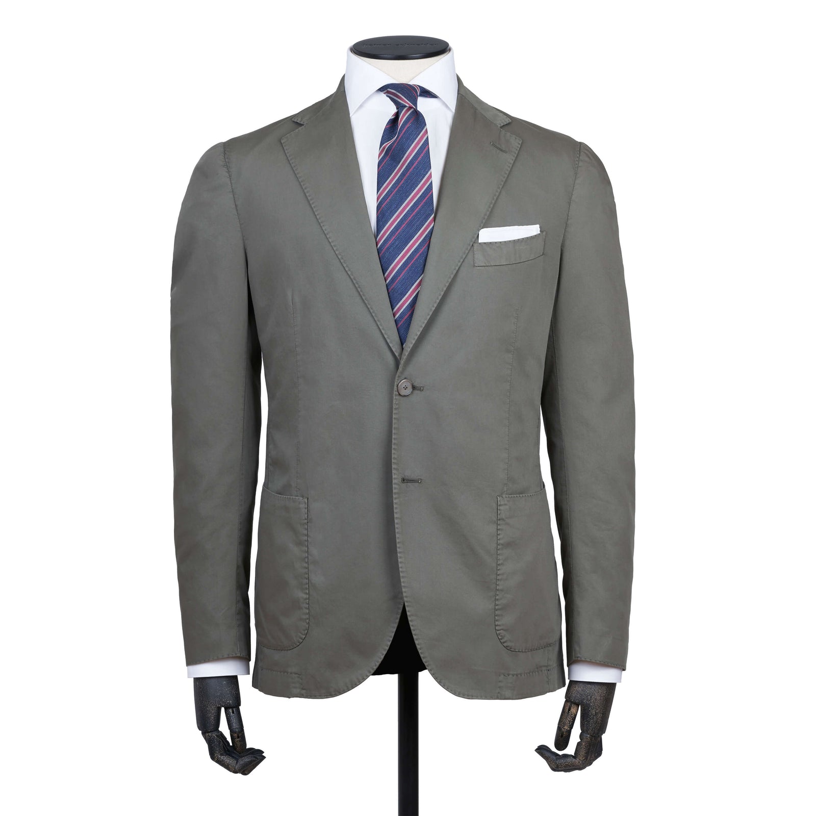 Hier präsentiert mit einer gestreiften Sommer Krawatte von Cesare Attolini. Einem handrollierten Einstecktuch von Simonnot Godard und einem klassischen weißen Baumwollhemd von Finamore Napoli.